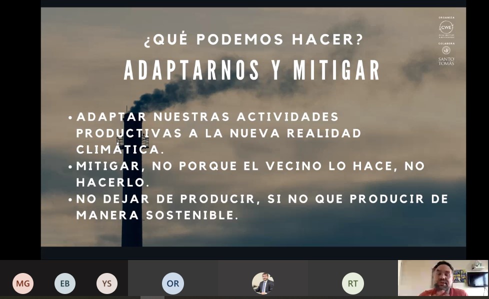 Esto fue organizado por la Organización Chile Weather & Environment en unión a Santo Tomás, particularmente sede La Serena. Los expositores de este webinar fueron: Gianfranco Marcone, Especialista en cambio climático y Meteorológico de Canal 13, Juan Francisco Muñoz, Sociólogo y Director de Carreras del Área Ciencias Sociales IP CFT Santo Tomás y, además, Isadora Rojas, Especialista en Cuidados Respiratorios y Jefa de Carrera Kinesiología en Universidad Santo Tomás