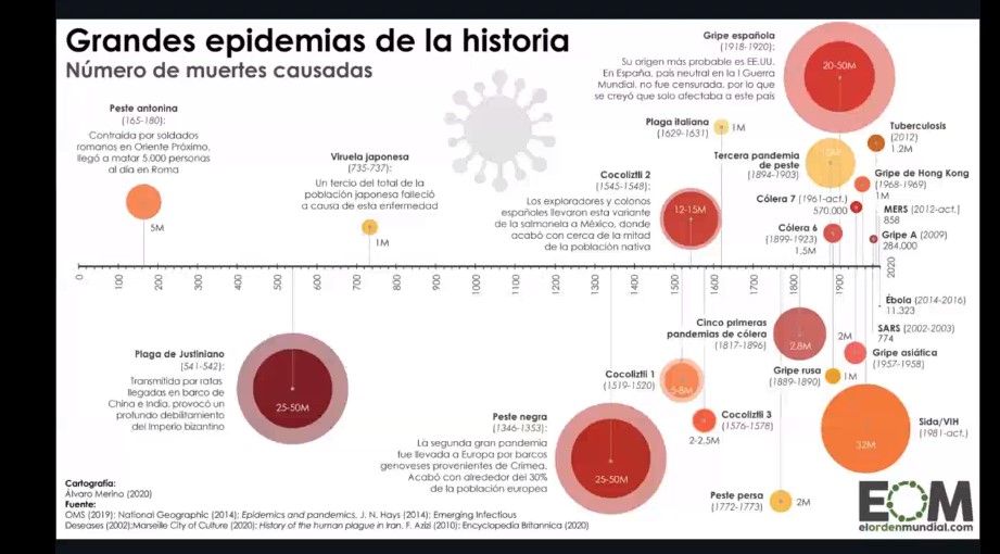 Esta convocatoria se inició con una compacta e interesante presentación relacionada a las temáticas que abordarían los expositores, en la cual se dieron a conocer hitos históricos, como la pandemia más grande que fue por el año 1347 en Europa, la firma del protocolo de Monterreal en el año 1987, con su objetivo de disminuir las sustancias de clorofluorocarburo que dañan la capa de ozono, ese protocolo lo firmaron 197 países de tal manera que todos se comprometieron a bajar esta producción y, además, se realizó una comparación social con la novela titulada “La Peste” del escritor Albert Camus en 1957, en la cual se recogió una serie de comportamientos, los cuales curiosamente son parecidos a los que pasamos ahora con el corona virus, algunos de los factores que destacan son: solidaridad, amistad, soledad, miedo, y efectos económicos que también se vivían en la sociedad de aquellos tiempos.