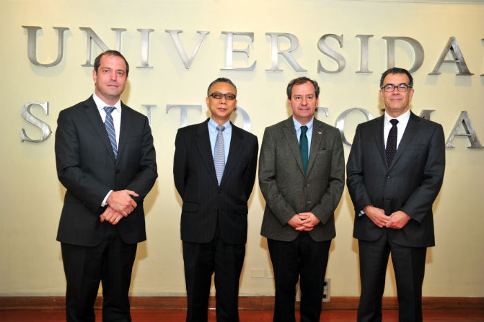 Juan Pablo Guzmán, rector nacional IP-CFT Santo Tomás; Xu Bu, embajador de China en Chile; Gerardo Verela, Ministro de Educación; Jaime Vatter, rector nacional UST.