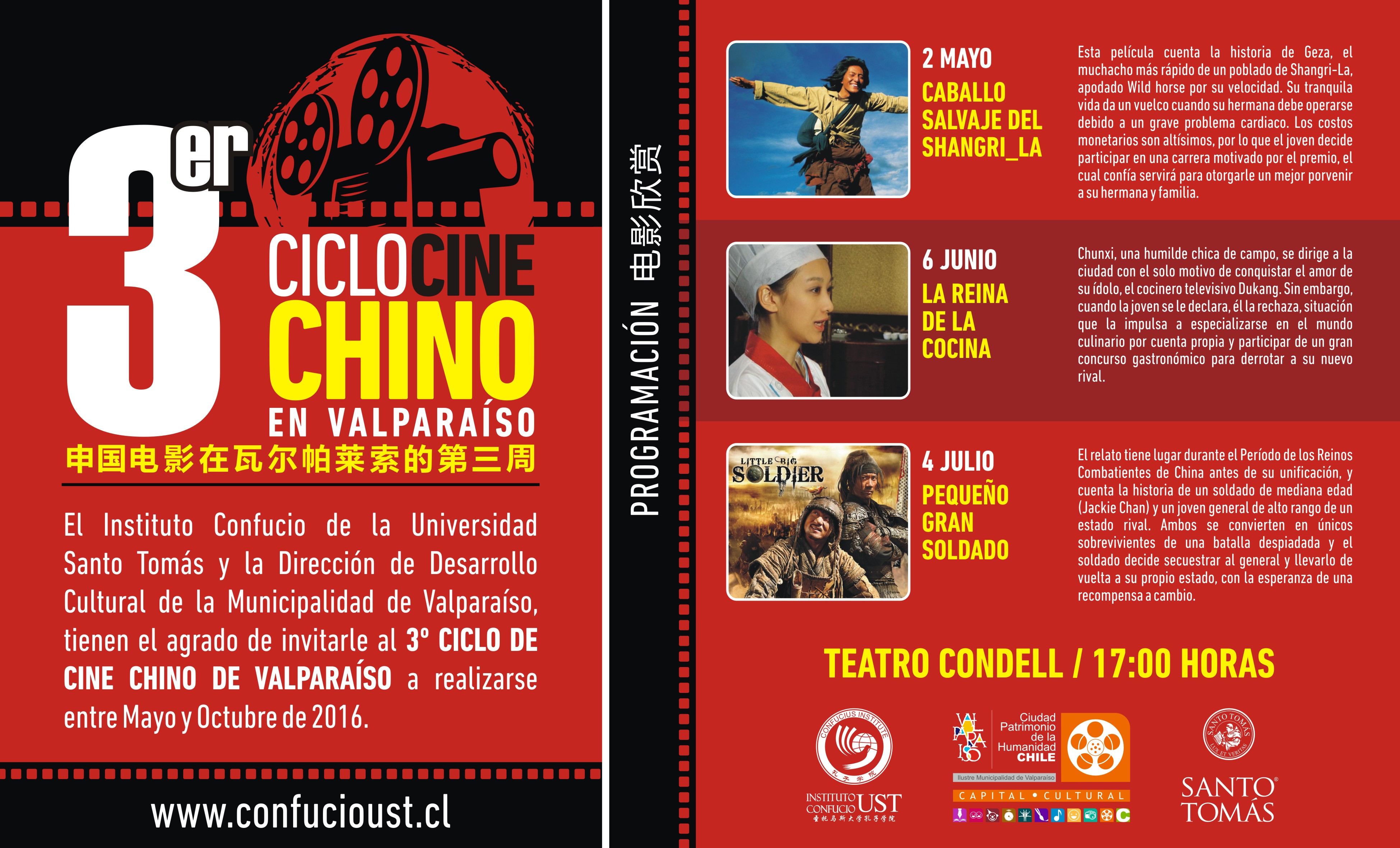 Restan días para el comienzo de un nuevo Ciclo de Cine Chino, organizado por el Instituto Confucio de la Universidad Santo Tomás (IC UST) en colaboración con la Dirección de Desarrollo Cultural de Valparaíso, el que tiene programado la presentación de seis largometrajes desde mayo a octubre del presente año. La primera cinta que se exhibirá es Caballo Salvaje de Shangri-La, el lunes 2 de mayo.