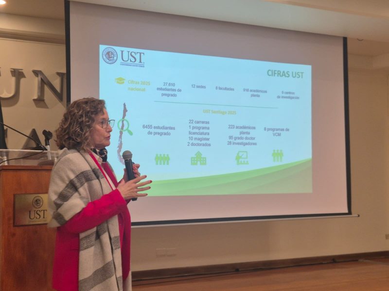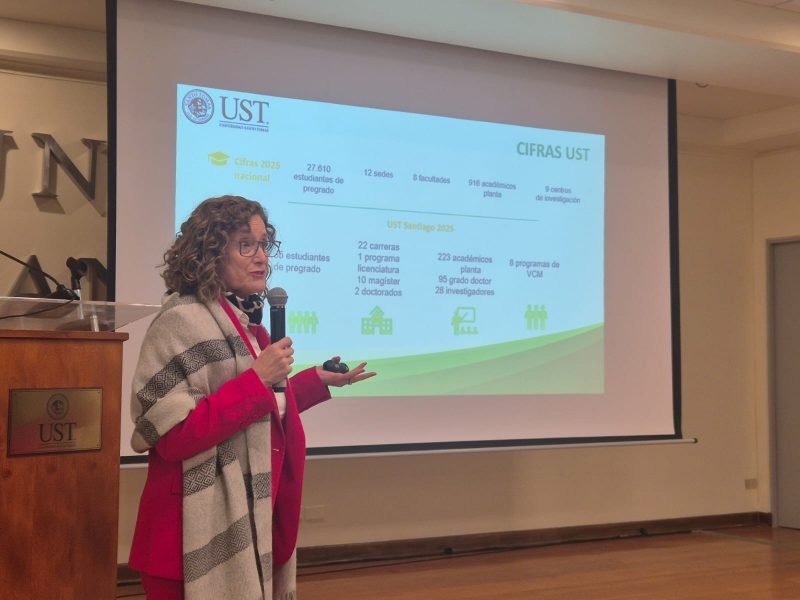 La autoridad presentó cifras que reflejan la magnitud y proyección de Santo Tomás: 12 sedes a lo largo del país, 9 centros de investigación, 23 carreras en la sede Santiago, 2 programas de doctorado y una amplia oferta de Educación Continua.