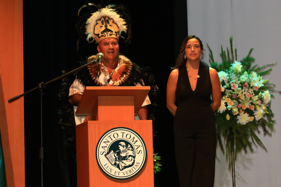 Un momento especialmente significativo se vivió en la segunda de las tres ceremonias de titulación que se realizaron en el Teatro Regional. Carlos Riroroko Mardones, proveniente de la Isla de Pascua, subió al escenario para dar una bendición a su hija Hagarahi, titulada de la carrera Preparador Físico, y a todos quienes la acompañaron en este tiempo de estudios en el continente: “Con mi cultura, vengo de Rapa Nui a buscar a mi hija, ahora me la llevo profesional para que ella entregue sus frutos a mi pueblo. Estoy agradecido de mahatu (corazón) porque Santo Tomás y todos los que la integran son los que dieron estos frutos a todos sus compañeros, en especial a mi hija”, señaló.