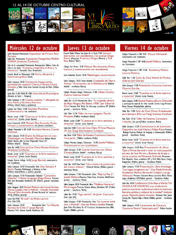 Con la presencia del Rector Nacional de la UST, Jaime Vatter, se realizó el lanzamiento de la VI Feria del Libro y las Artes 2016, actividad organizada por Santo Tomás Osorno y el municipio local, que este año se desarrollará desde el 12 al 15 de octubre, mayoritariamente en el Centro Cultural, ubicado en calle Manuel Antonio Matta 516.