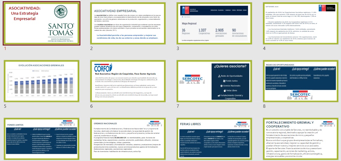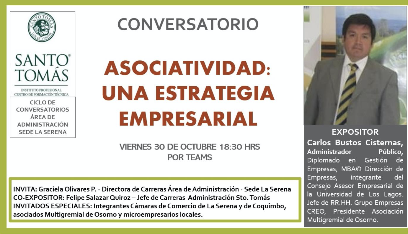 Formando parte del Ciclo de Conversatorios del área de Administración de la Sede La Serena de Santo Tomás, fue realizado el viernes 30 de octubre de 2020, el Conversatorio “Asociatividad: Una Estrategia Empresarial” en modalidad virtual vía Teams, dirigido a empresarios locales y asociaciones empresariales como también a las Cámaras de Comercio de la Región y beneficiarios de programas de fomento asociativo de Sercotec. En esta actividad se contó con la participación de nuestros alumnos y docentes del área y de invitados especiales y alumnos emprendedores.