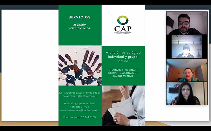 Finalmente, el área de Psicología elaboró talleres online divididos en grupos según edad: niños(as), adolescentes y familia, con el objetivo de generar un espacio de apoyo que favorezca la salud mental en cada uno de los grupos mencionados. Cabe destacar que en esta labor se sumaron alumnas de último año de carrera, quienes cursan su práctica profesional en el área clínica, asociadas al Centro de Atención Profesional (CAP) de UST Viña del Mar.