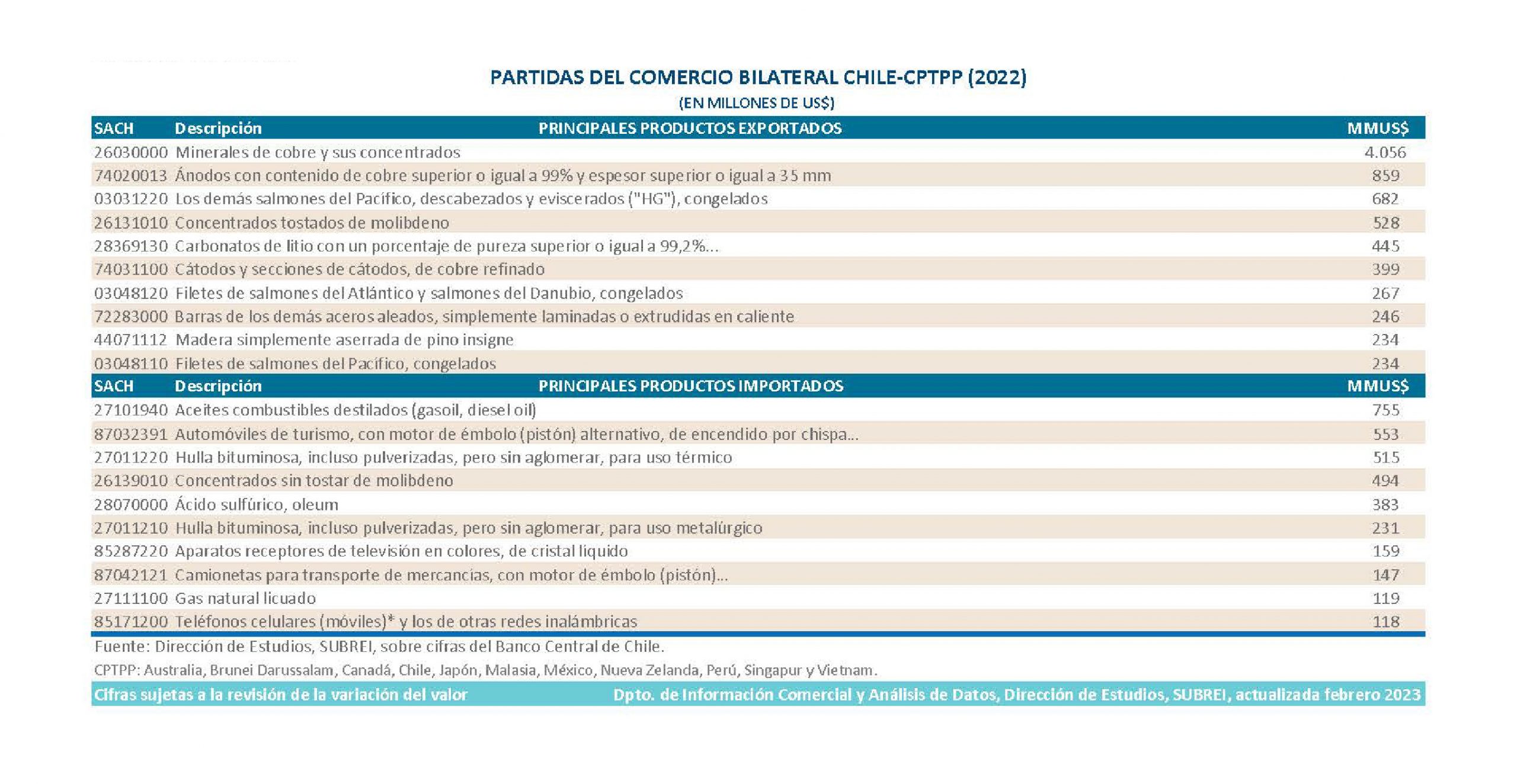 En relación con las partidas del comercio bilateral de Chile – CPTPP año 2022; y, en específico principales productos exportados, se aprecia en el cuadro siguiente que la partida más importante del total de este, la representa el sector minero. Esto implica que se incrementarán las oportunidades de seguir contribuyendo a las exportaciones totales por parte del sector minero con este tratado.