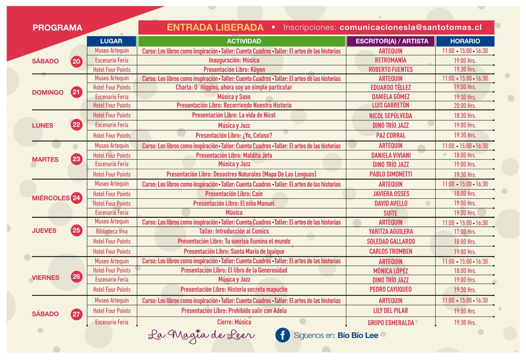| 18:30 horas | Presentación libro: La vida de Nicol Escritora: Nicol Sepúlveda. Lugar: Hotel Four Points. |