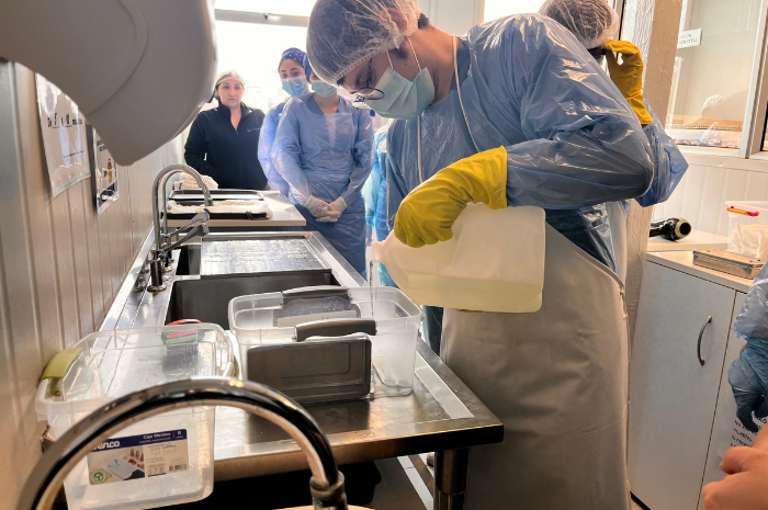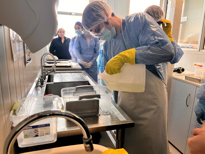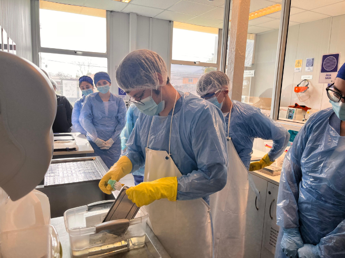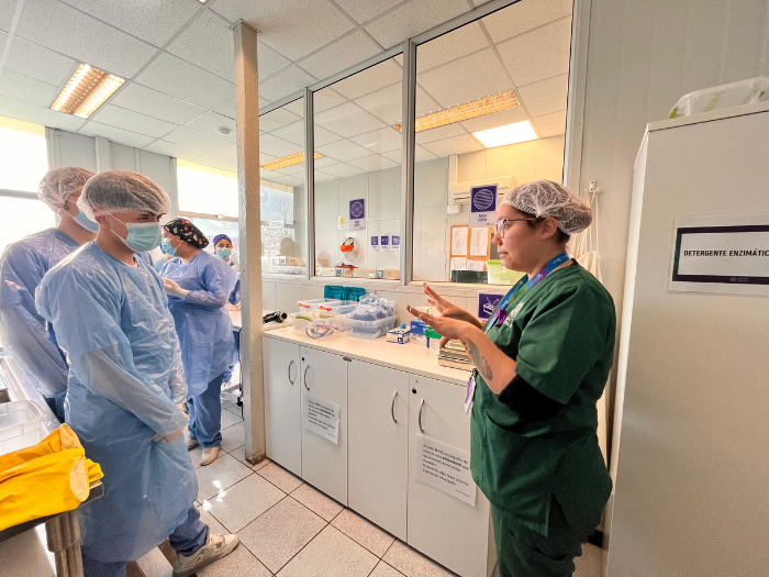 «Hoy pudimos desarrollar habilidades en la central de esterilización; ellos realizaron lavado y secado de material, empaquetándolo y aprendiendo puntos importantes como la importancia del lavado del material, de las temperaturas del autoclave, la existencia de diferentes tipos de controles químicos, físicos, biológicos, todo esto en una central de esterilización real, para fortalecer su formación en el área de salud», enfatizó Rose Mary Millán, encargada de laboratorio de simulación clínica y seguridad del paciente.