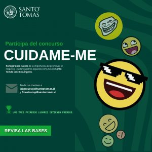 El concurso llamado «CuídaME-me» es organizado por el Centro de Aprendizaje y Dirección de Formación e Identidad de Santo Tomás sede Los Ángeles, bajo la consigna #amig@ date cuenta de la importancia de cuidar nuestros espacios comunes. Mira aquí las bases del concurso y participa.