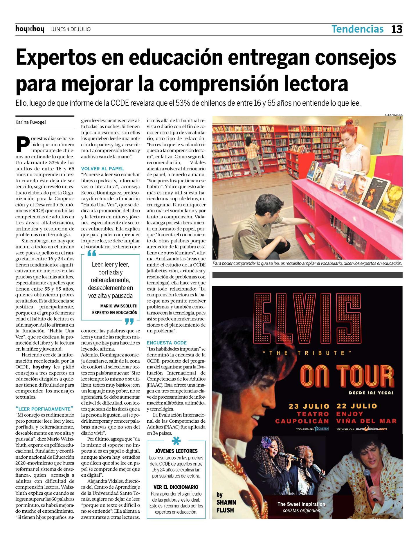 Un informe de la OCDE reveló que el 54% de los chilenos de entre 16 y 65 años no entiende lo que lee. Es por eso que Alejandra Vidales, directora del Centro de Aprendizaje del IP-CFT Santo Tomás San Joaquín, sugiere no dejar de leer «porque un texto es difícil o no se entiende». Ella alienta a aventurarse a otras lecturas, ir más allá de la habitual revista o diario con el fin de conocer otro tipo de vocabulario, otro tipo de redacción. «Eso es lo que le va dando riqueza a la comprensión lectora», enfatiza.