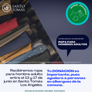La campaña “Ropero Solidario” comienza con la recolección de ropa para hombres adultos, entre el 13 y 17 de junio en los edificios de Santo Tomás Los Ángeles ubicados en Mendoza #120 y Manuel Rodríguez #131.