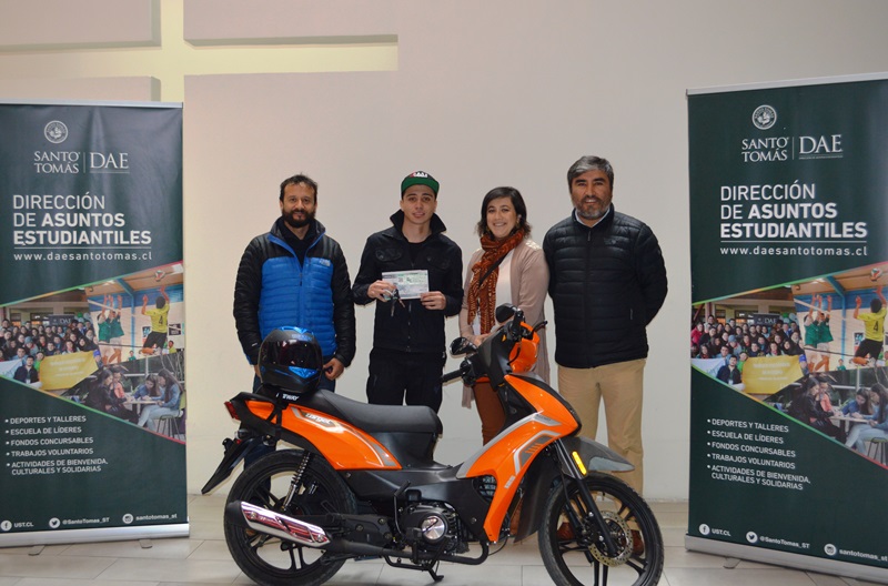 3877 fue el número que dio la suerte a Camilo Castillo, alumno de primer año de Servicio Social de Santo Tomás Santiago Centro que asistió a la fiesta tomasina el 27 de abril y resultó ser el ganador de una moto sorteada en el evento.